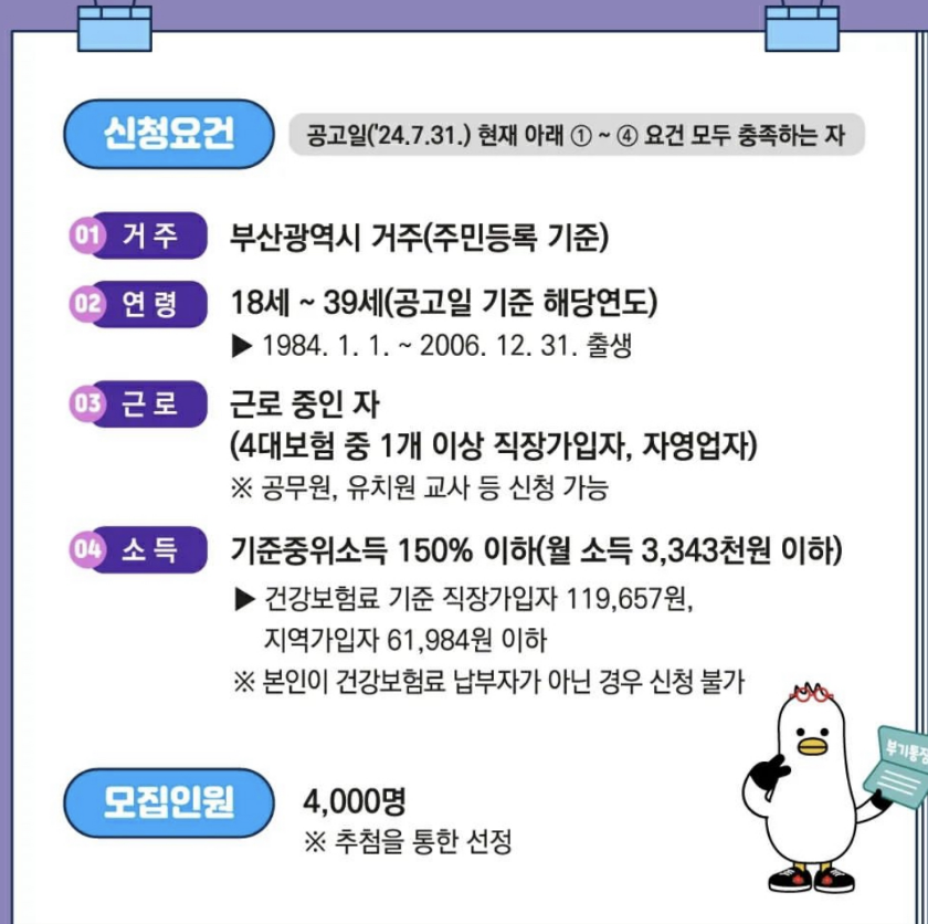 부산청년기쁨두배통장에 신청하려면 부산에 거주하는 만 18세부터 34세까지의 청년이어야 하며, 일정 소득 기준을 충족해야 합니다. 부산청년기쁨두배통장신청은 부산시의 공식 웹사이트 또는 지정된 은행에서 가능합니다.