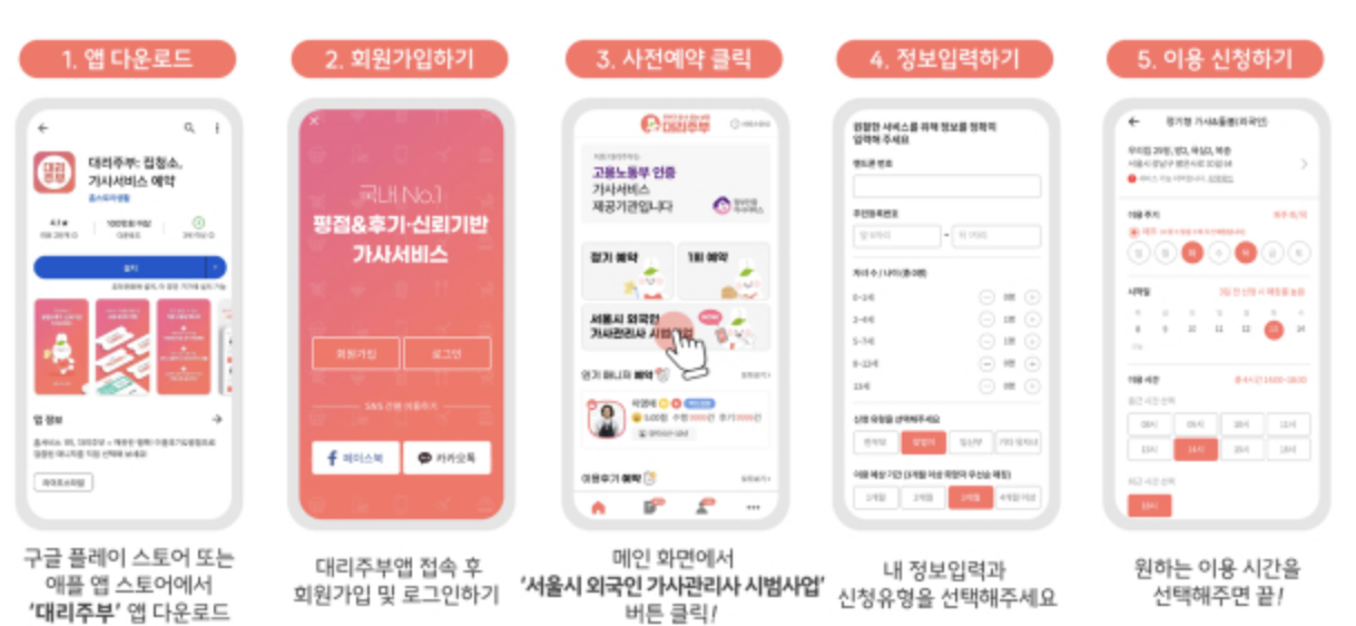 서비스 제공기관인 (주)홈스토리생활(대리주부) 또는 (주)휴브리스(돌봄 플러스) ‘모바일 앱’에서 회원가입 후 ‘서울시 외국인 가사관리사 시범사업’을 클릭해 24시간 신청할 수 있습니다. 🖱️