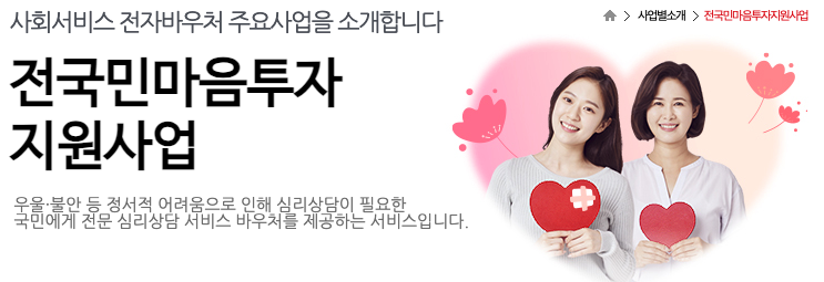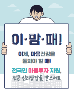 우울, 불안 등 정서적 어려움이 있는 국민에게 전문적인 심리상담 서비스를 제공하여 국민의 마음 건강을 돌보는 것을 목표로 합니다.