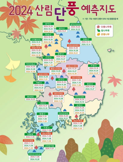2024년 산림단풍 예측 지도를 통해 단풍 절정 시기를 미리 확인하고 여행 계획을 세워보세요. 각 지역의 단풍 시기를 실시간으로 확인할 수 있습니다. 실시간 산림단풍 예측 지도 확인하기