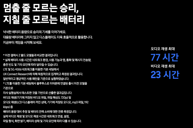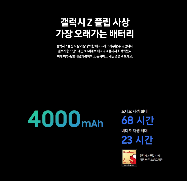- 갤럭시 Z플립6는 4000mAh의 대용량 배터리를 탑재하여 하루 종일 사용할 수 있는 충분한 배터리 수명을 제공합니다. 또한, 고속 충전과 무선 충전 기능을 지원하여 더욱 편리하게 배터리를 충전할 수 있습니다.